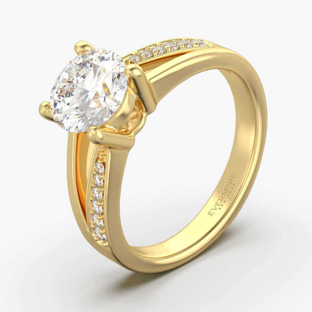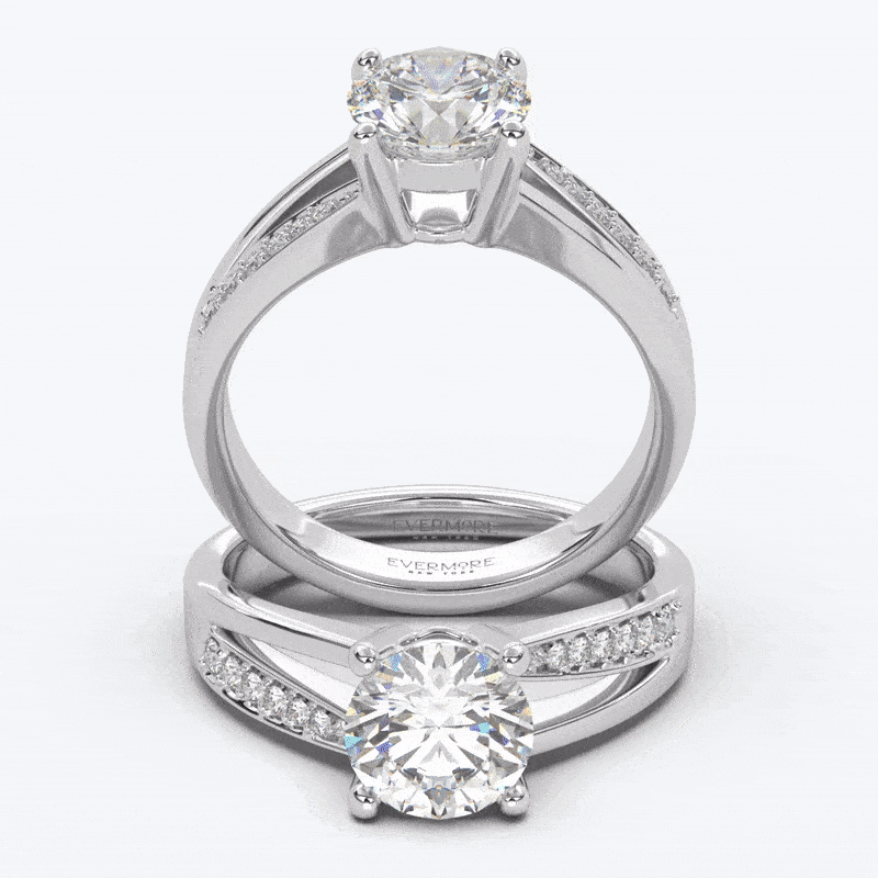 But what truly sets this ring apart is its distinctive split band. One side gleams with a tapering trail of pave-set diamonds, while the other remains polished and minimal, symbolizing two different paths coming together in perfect harmony.