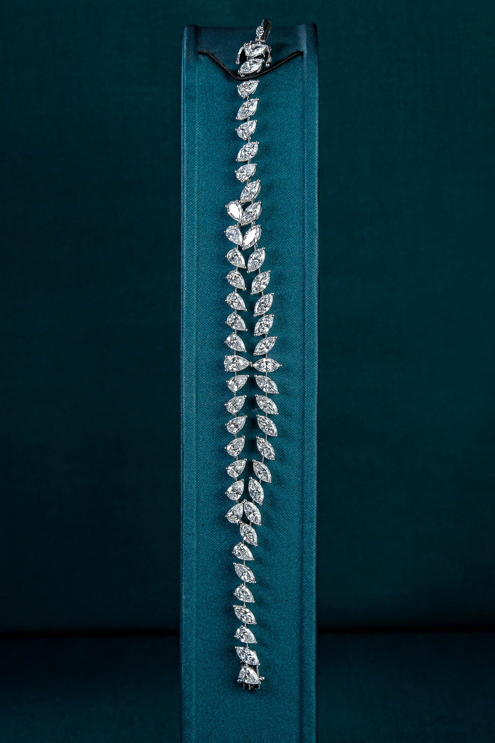 Striking yet refined, Sylvara carries the drama of a statement piece with the elegance of fine craftsmanship. Its elongated, leaf-like diamond arrangement flatters the wrist, making it the perfect companion for evening wear, celebrations, and moments that call for unforgettable shine. A true cocktail jewel — luminous, confident, and impossibly chic.